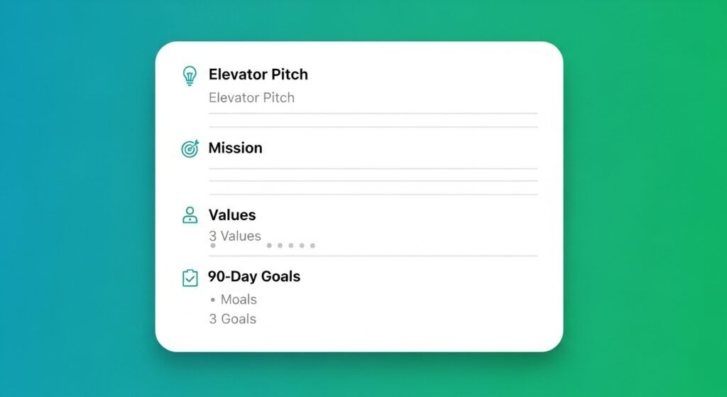 Summarize your business in one or two sentences people can repeat. Add a short mission (“why we exist”), a few values that guide how you work, and 90-day goals so you know what to ship next. This keeps daily tasks aligned with your bigger purpose.